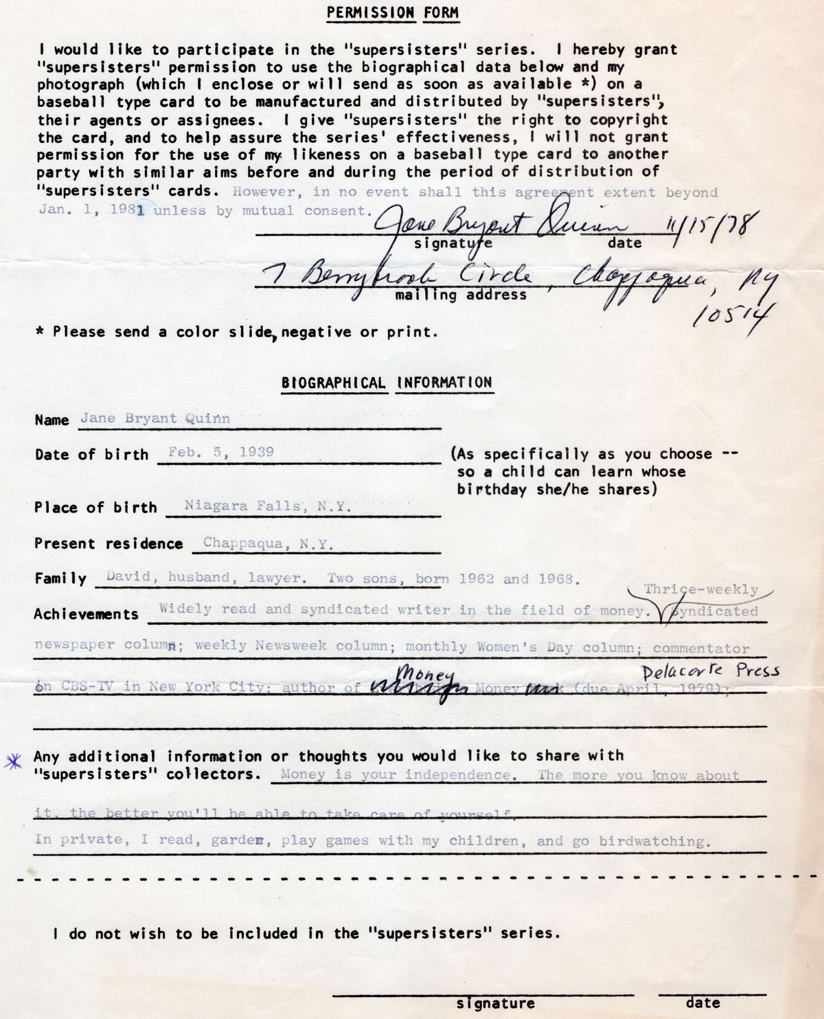Jane Bryant Quinn supersisters permissions form