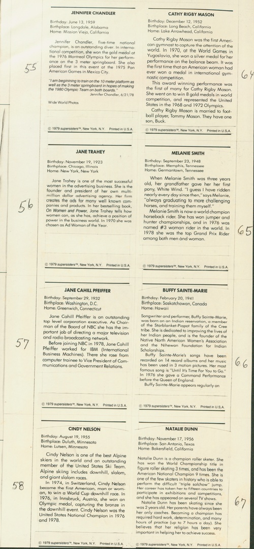 This is a partial supersisters poster proof that features the biographies of Jennifer Chandler (not included in the final deck), Jane Trahey, Jane Cahill Pfeiffer, Cindy Nelson, Cathy Rigby Mason, Melanie Smith, Buffy Sainte-Marie, and Natalie Dunn. All supersisters cards were printed as posters and cut to order.