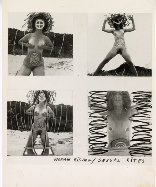 This is Mary Beth Edelson’s photo, Woman Rising/Sexual Rites, from her Woman Rising series in 1973.