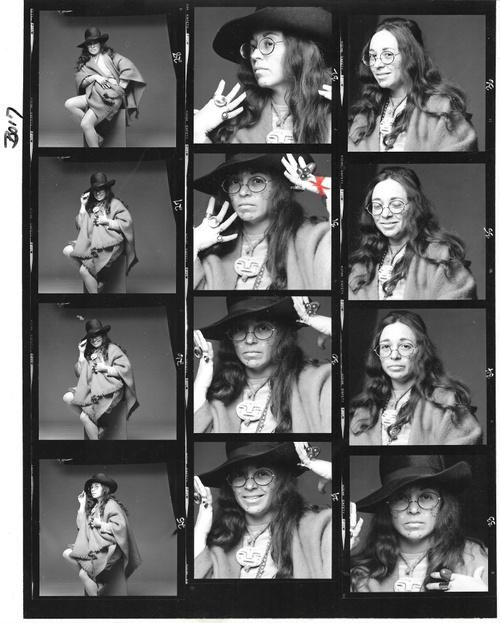 Contact sheet of black and white portraits of Phyllis Krim, photographed by Gary Schroeder, most likely in San Francisco, circa 1969.