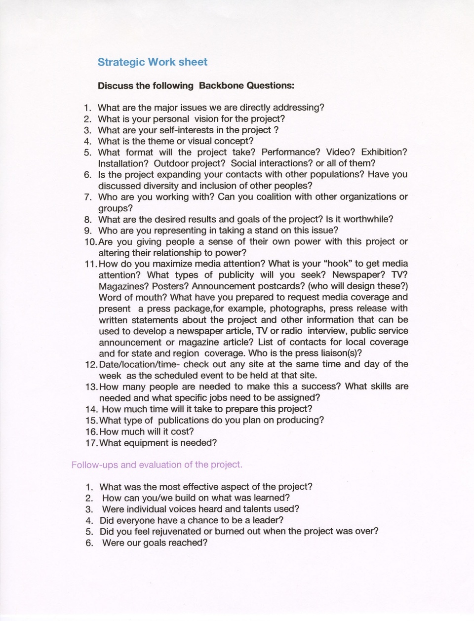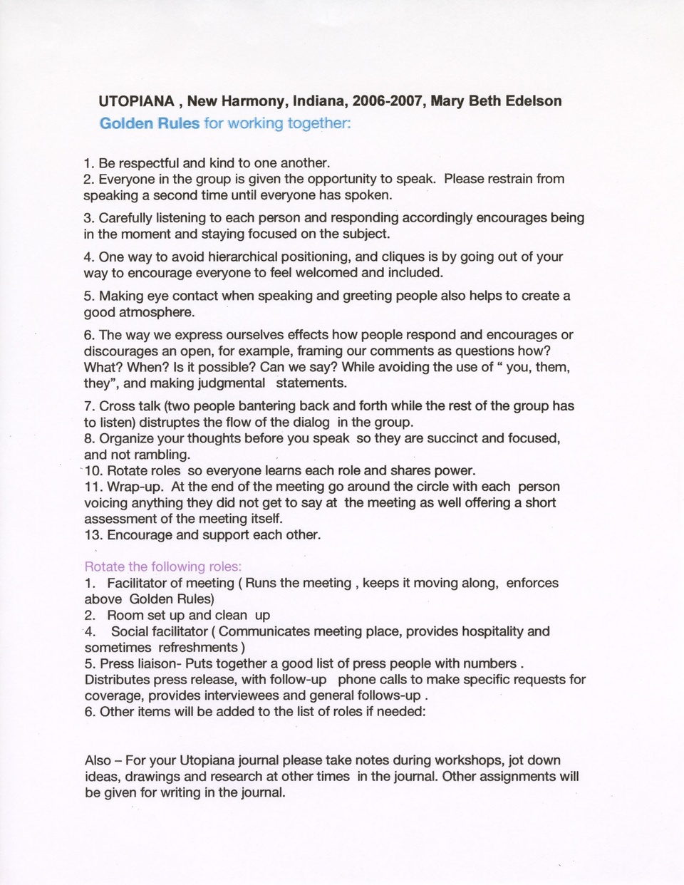 This document shows Mary Beth Edelson’s “Golden Rules for working together,” and Strategic worksheet discussion questions, created for UTOPIAN, held in New Harmony, Indiana, in 2006-2007.