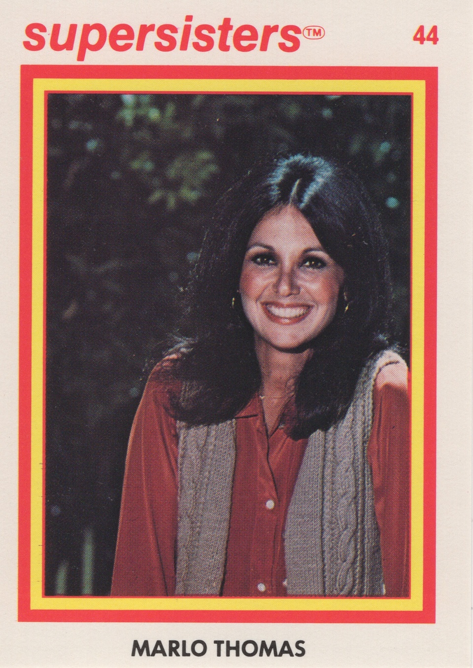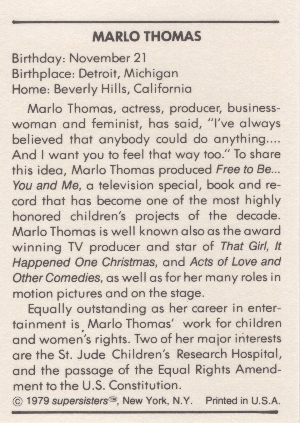 This ephemera is from the original supersisters trading card set which aimed to empower women and girls by highlighting accomplished women in a wide variety of fields. The cards were created by sisters Lois Rich and Barbara Egerman after Lois’ 8-year old daughter, Melissa, asked why there weren’t any women on baseball trading cards. This card features Marlo Thomas, an accomplished actress and producer who championed women’s and children’s rights.