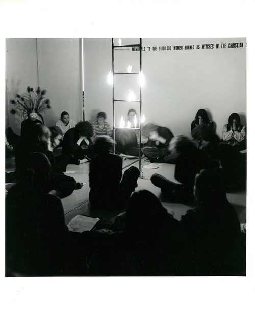 This is a photo from Mary Beth Edelson’s exhibition, Memorials to the 9,000,000 Women Burned as Witches in the Christian Era.
