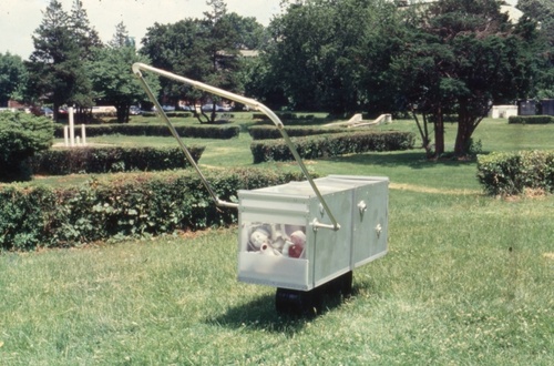 This piece was shown in the exhibit Outdoor Sculpture “93 at Manhattan Psychiatric Center on Ward’s Island, NY from June 26- October 31, 1993. It was curated by Glenn Reed and John Rosis. It was sponsored by the Organization of Independent Artists. It was made of steel, plexiglass, toys and measured 38"H x 20” W x 61" Handel 49"D.