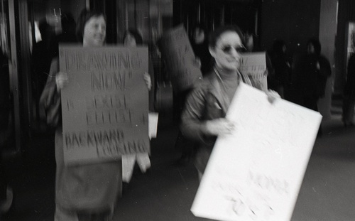This is a photo of a demonstration by the MoMA and Guggenheim Ad Hoc Protest Committee for MoMA’s lack of women artists in its then current exhibition, Drawing Now. The protests took place in 1976.